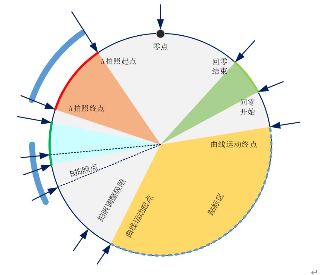 在貼標(biāo)的托盤上,瓶子會被卡到托盤的凹槽中,如果瓶子是非圓形的,那么這個托盤必須旋轉(zhuǎn)到所需貼標(biāo)面(如有些瓶子是菱形或者橢圓形),因此,需要獲得一個旋轉(zhuǎn)角度使得其剛好可以作為貼標(biāo)的起點(diǎn),而另一方面,這個托盤在進(jìn)入貼標(biāo)區(qū)域的時候,它必須與貼標(biāo)頭保持線速度的一致,然后再去回零,整個過程根據(jù)貼標(biāo)尺寸的變化,是一個電子凸輪曲線(CAM)位置環(huán)控制,這個就需要托盤高速跟隨主軸,并且隨著貼標(biāo)尺寸規(guī)格的變化可以自動計算凸輪曲線,并獲得光滑的切換能力。圖3-則顯示了每個托盤都需要進(jìn)行的這個運(yùn)動控制過程。