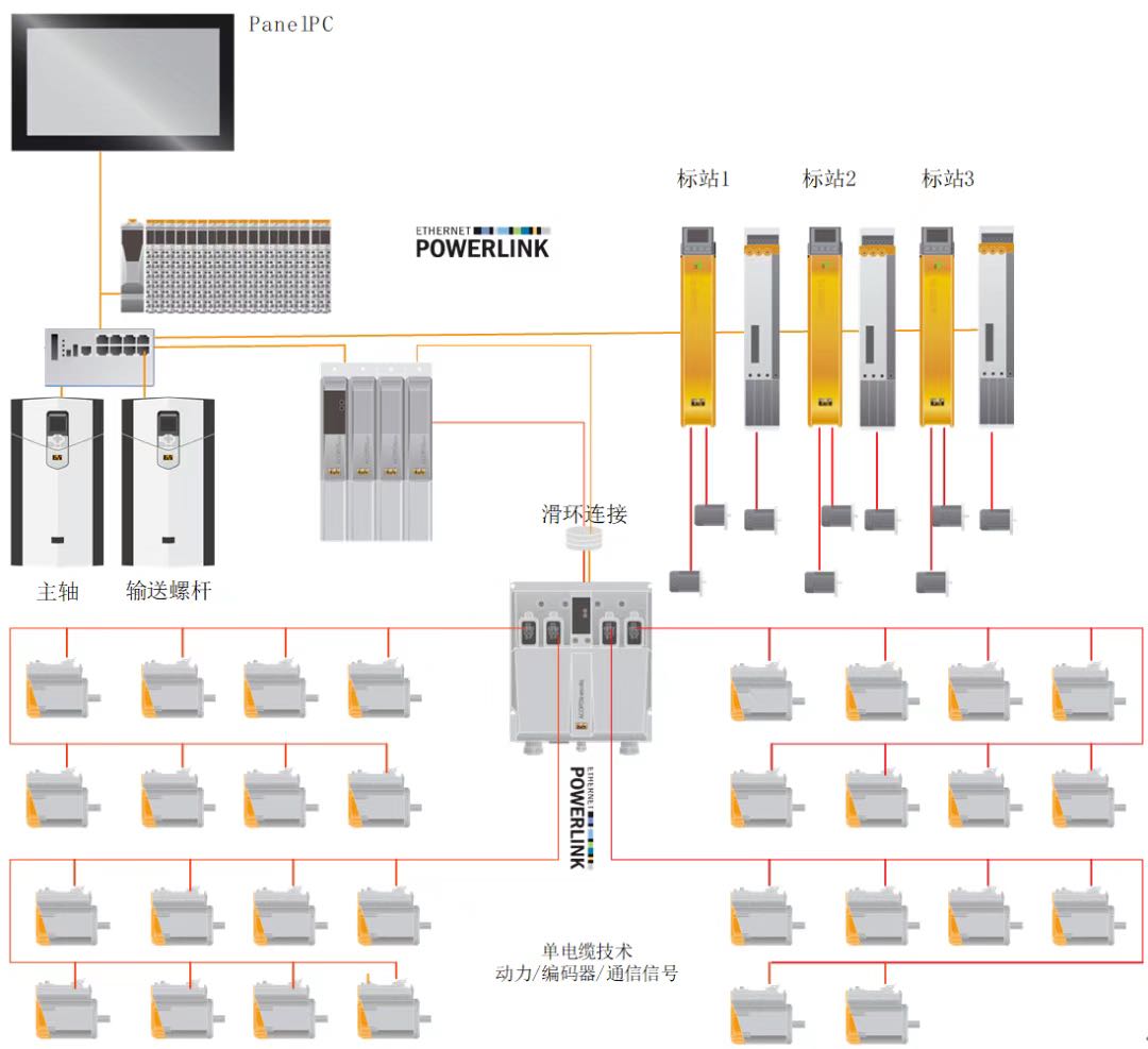 從圖5整個機(jī)器的配置可以看到,多達(dá)36個伺服電機(jī),其高速同步性,由POWERLINK實時網(wǎng)絡(luò)來保障,達(dá)到百微秒級的任務(wù)周期。而另一方面采用ACOPOSmotor伺服驅(qū)動與電機(jī)一體的設(shè)計,也讓整個接線變得更少,且空間緊湊,易于機(jī)械的安裝維護(hù)。