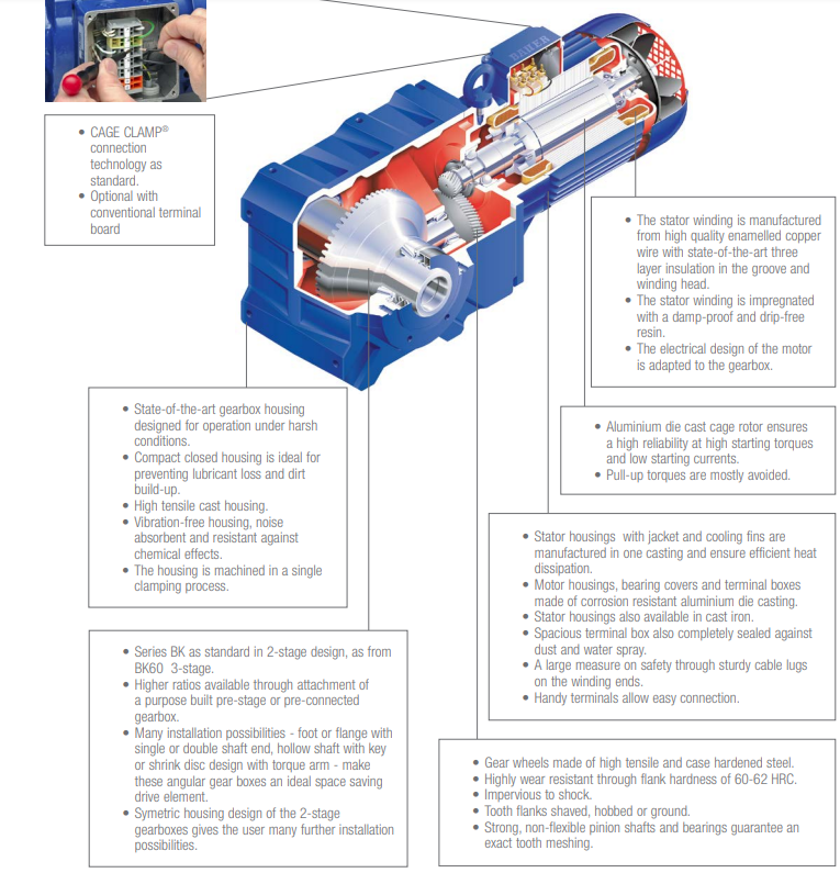 BS 減速電機是經濟的直角渦輪減速電機,可安裝在極為狹小的空間內。經濟劃算的直角渦輪減速電機為可靠性、效率和經濟性樹立了新標準,具備無與倫比的標準特點,如:最小尺寸的空心軸。逆變器友好型設計不僅可確保目前輕松集成,而且還能滿足未來需求。BS 減速電機擁有靈活的安裝選件,包括軸、基座、表面與法蘭解決方案。電機接線盒可以安裝在圍繞電機架旋轉 90° 的其他位置,實現無與倫比的集成可能性。