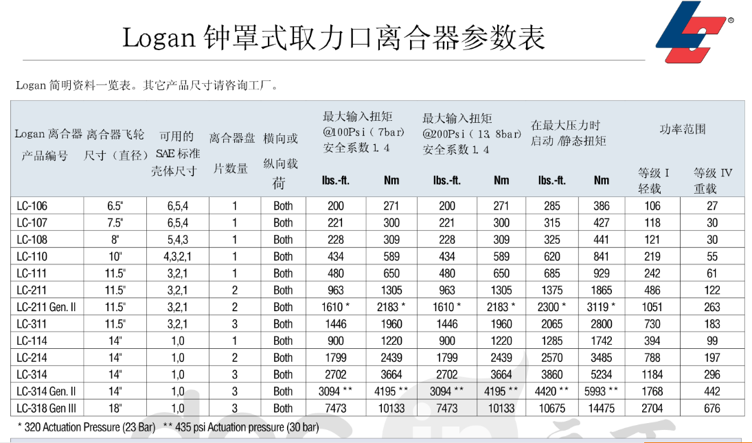 Logan氣/液驅(qū)動(dòng) 鐘罩式殼體取力口離合器式自調(diào)節(jié)的,設(shè)計(jì)成直接安裝到柴油發(fā)動(dòng)機(jī)或者汽油發(fā)動(dòng)機(jī)的飛輪上。摩擦圓盤組為干式應(yīng)用設(shè)計(jì)。通過(guò)一個(gè)固定的缸套-活塞布置或者通過(guò)內(nèi)置軸和離合器油道來(lái)完成。離合器的傳動(dòng)軸通過(guò)內(nèi)孔或鍵槽來(lái)安裝。扭矩從盤片組傳遞到安裝在發(fā)動(dòng)機(jī)飛輪上的齒輪傳動(dòng)齒圈上。Logan離合器主杠加壓, 推動(dòng)活塞夾緊或鎖住摩擦片或分離鋼片。當(dāng)壓力移走, 回位彈簧使摩擦片和鋼片分離, 當(dāng)鋼片和摩擦片分離后, 可以保持運(yùn)行間隙。